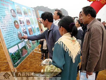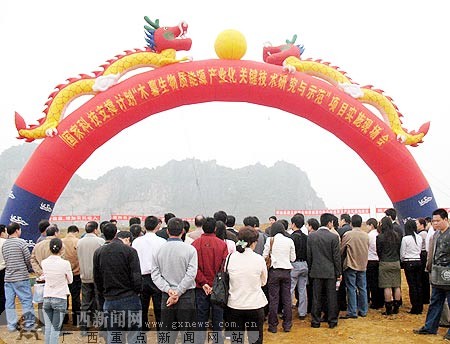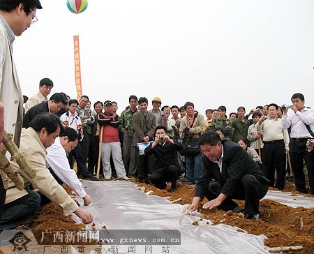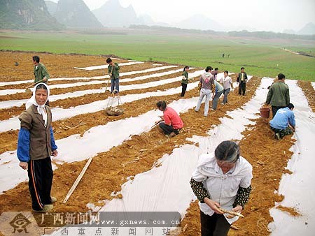 农户纷纷实地实践。叶焱焱摄 (记者叶焱焱)3月27日,“木薯生物质能源产业化关键技术研究与示范”项目实施现场会在广西隆安县乔建镇廷罗村召开。现场的村民们在技术人员的指导下,熟练地把筛选出来的高产高效的木薯种栽种入地。 据了解,“木薯生物质能源产业化关键技术研究与示范”是广西农业科技研究项目有史以来力度较大的农业项目,2007年获国家科技部立项、国家专项经费3800多万元,同时广西自治区配套研究经费500万元。项目主要开展木薯优良新品种选育、高效栽培技术及以木薯燃料乙醇为重点的产品加工技术研究,组织燃料乙醇产业关键技术攻关和生物质产品开发。 该项目的实施,将提高生物质厌氧发酵技术在木薯酒精废液搞浓度有机废水产业化应用的水平,可促进污水处理等环保产业的发展,同时项目还利用酒精废液中不易分解,但对农作物又有营养的其他有机成分用于木薯的灌溉,实现高浓度有机废水的群补循环利用,可节省成本,提高木薯的产量和质量,改良土壤,形成新的经济循环模式。