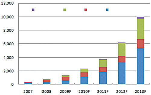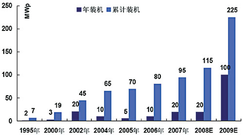 太阳能光伏发电在不远的将来不仅要替代部分常规能源,而且将成为世界能源供应的主体,将给能源发展带来革命性的变化。根据欧洲联合委员会研究中心(JRC)的预测,到21世纪末,可再生能源在能源结构中将占到80%以上,其中太阳能发电占到60%以上,充分显示出其重要的战略地位。 国内外市场长期均会大幅增长 受国际金融危机的影响,各国政府补贴力度下调,信贷政策收缩,预计未来两年全球新增光伏装机容量增速将有所减缓。根据Display bank公司的最新预测,受世界经济下滑、需求减少、投资放缓的影响,未来两年全球光伏市场容量和增长速度均比先前预测的要低,但光伏产业作为未来能源产业发展的主要趋势并未改变。2011年以后光伏市场增长幅度会加快,年复合增长率将超过60%,预计2013年市场需求量将达到37GW。其中德国、西班牙、美国、意大利和日本的合计份额仍将保持在85%以上,仍是主要需求地区。 根据美国国家光伏中心的预测,至2020年全球光伏总装机量将达70GW,表明世界光伏产业发展有着广阔的市场空间。2020年光伏发电成本可以降低到每千瓦时10美分以下,在几乎整个电力市场上都具有竞争力。随着太阳能电池成本的降低,MW级光伏电站将不断出现。 2030年以后光伏发电的成本会继续降低,电池的转换效率将进一步提高,光伏系统组件将发展成建筑物通用的构件,可以实现大规模的标准化应用,几乎所有新建筑都将安装光伏阵列。欧盟希望在2030年安装的光伏发电装置增加到200GW左右,全球可能会达到1000GW。 据统计显示,2002年以前国内光伏发电装机容量一直徘徊在5MW左右。2002年到2004年,国内光伏市场大幅攀升。2008年我国太阳能电池以2050MW的产量跃居全球第一,但装机容量仅为20MW,我国制造的太阳能电池几乎全部出口。估计2008年中国累计安装量达到115MW。中国光伏应用仍然以独立系统为主,并网光伏发电应用比例还很小。 我国是能源生产和消费大国,随着经济持续快速发展和工业化进程的加快,我国的电力需求也快速增长。据中国电力科学院预测,2010年我国电力供应缺口为52.9GW,占需求的7.7%;2020年为91GW,占8.2%。可见国内电力市场日益增长的需求为光伏产业的应用发展提供了有力支撑。国家发改委提出了2010年光伏组件及系统累计安装450MW的目标。预计2008-2010年太阳能光伏装机容量的年均复合增长率将达到80.86%。到2020年,我国光伏累计装机容量将达到1.8GW。 TFS发展趋势与投资特点 TFS(薄膜太阳能电池)成本较低,转换率日益提高,性价比适中,有着广阔的应用空间。从2008年到2013年,薄膜太阳能电池市场平均年增长率高达67%,到2013年产量达到10GW,约占整体太阳能电池市场的20%以上,其中非晶硅薄膜太阳能电池仍为主流产品。 2008年8月,富士经济公布的太阳能电池全球市场调查结果显示,薄膜硅太阳能电池2007年市场规模为578亿日元。预计2012年将提高到2007年的9.7倍,达到5595亿日元。由于薄膜太阳能电池的原料价格低、制造工序少,因此今后有望大幅降低成本。 全球硅基薄膜太阳能电池生产厂家主要有夏普、美国联合太阳能、Bangkok Solar、日本Kaneka Hybrid、Sunfilm、Malibu、宇通光能等。2008年全球硅基薄膜太阳能电池产量预计为585MW,2009年将增长至1104MW,增长率为88.7%。 业内的分析机构和众多专家都指出,薄膜太阳能电池在未来5-10年内将以50%左右的年平均增长率增长,在快速增长的整体太阳能电池产业中独占鳌头。但从事硅薄膜太阳能电池产业也必须洞察其风险。除了在市场、成本、技术方面的风险外,在资金需求、供应链组织、生产动力供应和技术人才方面都有较高的门槛。 在资金需求方面,一条40MW-50MW的非晶硅薄膜电池生产设施的总投资在10亿元左右,而公认的经济规模应在300MW-500MW。一座年产能为300MW的厂房,占地面积为20万平方米,总投资约为35亿元。 在供应链组织方面,产品生产所需的高透光率的超白玻璃(或镀有透明导电膜的TCO玻璃)、高纯硅烷、PVB膜等,都只有有限的供应来源。如何争取稳定且价格便宜的材料来源,也是投资人面临的主要难题。 技术人才一直是薄膜太阳能电池发展的瓶颈之一。除电池本身的结构设计、分析检测需要大量专业人员外,化学气相沉积(CVD)、真空溅射、激光刻线等特殊工艺,以及包括多种特殊气体、高纯水、净化空调系统等的厂务支持系统,都需要大量有专业知识背景和实际操作经验的员工。而由于目前大量的项目正在兴建,人才竞争也变得空前激烈。 总之,每个欲投身其中的企业都应该全面分析自己所面临的机会和挑战,理性客观地做出自己的投资决策。 2007~2013年全球光伏市场预测 单位:GW 资料来源:Displaybank 2009.Q1 国内光伏装机容量统计与预测 数据来源:CEEDI整理 2007-2013年全球薄膜太阳能电池市场预测 单位:MW 数据来源:Displaybank 2008.12
