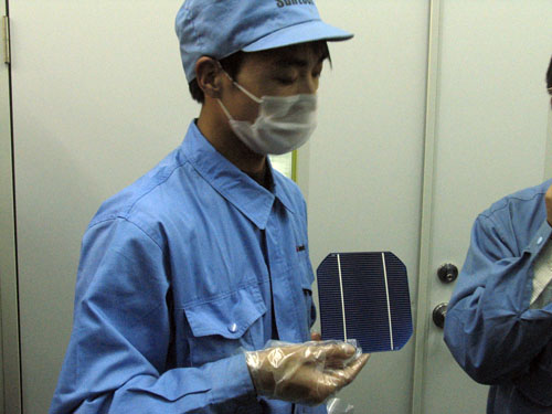 (记者 张起卫)今天,“印象·河南2008省外媒体中原行”记者团来到洛阳尚德太阳能电力有限公司采访,并参观了其太阳能电池板的生产线。 太阳能电池板的生产线 太阳能电池板 洛阳尚德公司一期工程建设已于2006年8月全面展开,第一条生产线产能30兆瓦,当年10月公司启动了90兆瓦太阳能电池扩产项目建设,目前项目机电安装已经完毕,可实现年产能120兆瓦,2007年实现销售收入17亿元。洛阳尚德在全国太阳能行业实际产出统计中排行第二,仅次于无锡尚德。 在尚德公司宽敞洁净的生产车间,全自动镀膜机正在为一片片边长12.5厘米、厚度仅220微米的电池片镀上一层层蓝色的薄膜。车间主管介绍说:“薄薄的太阳能电池充满科技含量,光是镀上这一层膜,就可以大大增加电池对太阳光的吸收效率,并可以连续使用至少25年。” 尚德总公司的“光伏能源工程技术研究中心”建有国际一流的化学实验室、物理实验室、光刻实验室、扩散实验室等,配置了国际一流的研发和试验检测设备。“中心”聚集了国内外一流的光伏技术专家和专业技术人才,自主研究开发了高效低成本晶体硅太阳能电池产业化关键技术、光伏组件工程化技术、光伏系统工程技术、应用产品集成化等国际和国内光伏技术领域的高端技术,核心技术拥有自主知识产权30余项,获得国家科技计划项目9项、省市科技计划项目14项。 公司负责人介绍,洛阳尚德二期240兆瓦项目已经开工,到2009年年底将竣工投产,年销售收入可达150亿元人民币。洛阳尚德将成为无锡尚德之后国内太阳能光伏行业规模最大的企业,并在高效薄片晶体硅电池市场占有绝对多数份额。