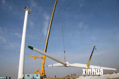 (傅新春)位于河北沧州沿海的国华爱依斯(黄骅)风电场一期工程装机容量为4.95万千瓦,目前33台风电设备已进入安装阶段,预计2009年5月实现并网发电。沧州地处河北东部沿海区域,风能资源丰富,适宜进行大型风电场的开发建设。 12月26日,工作人员在沧州黄骅沿海风力发电场工地施工。 新华社发(傅新春 摄)