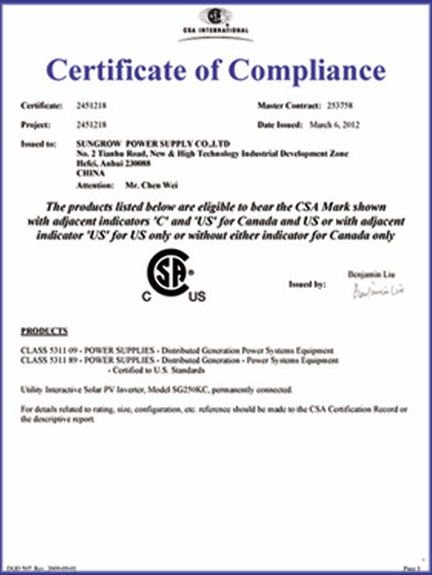 此次,SG250KC再次凭借良好的设计和优异的技术性能指标,顺利通过CSA的各项检测及相关标准的指令和要求,取得了CSA认证。这也是国内第一个通过该认证的大功率光伏逆变器,进一步壮大了阳光电源在北美市场的产品阵线,增强了公司产品的竞争力,为阳光电源北美市场的拓展提供了新的支撑。