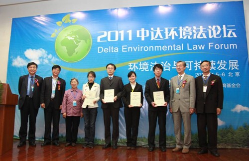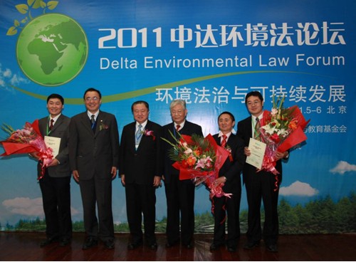 郑崇华董事长(左三)、清华大学谢维和副校长(左二)、中国社科院马骧聪教授(右三)分别为“2011年中达环境法学者”中国政法大学王灿发教授(右二),及二位“2011年中达环境法青年学者奖”获得者武汉大学秦天宝教授(右一)、清华大学邓海峰副教授(左一)