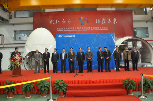 西安下线仪式 (2010年3月31日—西安)2010年3月31日,金风科技股份有限公司(金风科技)的全资子公司——西安金风科技有限公司(西安金风)正式开业,第一批风力发电机组同时下线。陕西省、西安市各级相关政府部门领导,中国长江三峡集团公司和中国水利投资集团公司,以及来自全国各地的金风科技的客户和业务合作伙伴共二百余人出席了此次仪式。盛大的庆典活动过后,与会嘉宾参观了新落成的西安金风总装厂和首批下线产品。 新建成的西安金风位于西安市经济技术开发区泾渭工业园陕汽路西段9号,拥有母公司金风科技旗下目前最大的总装车间,面积达到了16000平方米,具备年产200台兆瓦级风力发电机组和1000台发电机的生产能力,计划2010年实现产值20亿元左右,在陕配套采购额也将达到约20亿元。西安金风是陕西省装备制造业重点项目,它致力于打造全省风电产业集群,实现风电机组制造、零部件供应、风电场投资开发和运营维护等业务的整体协调发展。 西安金风生产具有自主知识产权、国际领先水平的1.5MW、2.5MW直驱永磁风力发电机组,并将以制造基地为依托,进一步建设计量检测中心和物流备件中心。西安金风的建成投产,将为陕西省、西安市利用风电产业促进地方产业结构升级,推动经济发展,以及建立环境友好城市,做出有益的示范和表率。在发展业务的同时,金风科技还计划与西安市当地的院校合作,创建风电工程专业,为风电产业发展培育人才。在仪式上,陕西省和西安市的领导发表讲话,对西安金风实现当年建设、当年竣工并当年投产的高效率表示了高度评价,同时肯定了西安金风在陕西省风电发展中的龙头地位。 关于金风科技: 金风科技是国内成立最早和目前规模最大的风电设备制造企业,致力于成为全球风电行业的整体解决方案提供商。在十几年的成长过程中,金风科技坚持自主研发,推进产品和服务创新,业务发展迅猛,自2000年以来销售业绩平均增长率连续九年超过100%。2009年,公司总资产达150亿,年销售额突破107亿。截至去年底,金风科技累计销售风力发电机组7200多台,已完成安装5500多台。金风科技是国内唯一一家在兆瓦级机组技术上拥有完全自主知识产权,并达到大规模量产的企业。金风科技的直驱永磁风机技术是目前全球最先进的风机技术,具有零部件少、耗材少、运行效率高等明显优势,深受全球市场好评,代表了未来风电技术的发展方向。迄今,金风科技已有1500多台兆瓦级直驱永磁风机成功投入运行,运转良好,发电量高,平均可利用率接近98%,代表了行业最高水平。 与此同时,金风科技也启动了“人才、市场、技术产品和资本国际化”的全球化战略布局,海外市场拓展初见成效。目前,金风科技已经开始在欧洲、美国、澳洲和南非等地建立分支机构,产品也已落户美国、加拿大、古巴等海外市场。
