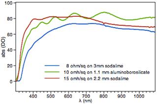 图1 染料敏化太阳电池结构示意图 1. 传统DSSC对光的利用 2.1导电玻璃对光的利用 由于传统DSSC采用的三明治结构要求光阳极衬底必须具有透光性,因此透明导电玻璃(transparent conductive oxide,简称TCO)成为传统DSSC衬底的最佳选择,这也是目前研究者所普遍采用的。它是在玻璃表面附着一层包括In、Sb、Zn和Cd的氧化物及其多元复合氧化物薄膜材料而构成的。透明导电薄膜以掺锡氧化铟(In2O3:Sn,简称ITO)和掺氟的氧化锡(SnO2:F,简称FTO)为代表。导电膜的研究与应用较为广泛、成熟,在美、日等国已实现产业化生产。ITO经高温热处理后,面阻会呈数量级增大,而FTO在此温度热处理后性质仍然稳定,因此FTO常作为传统DSSC中TiO2薄膜的基体材料。图2所示为SOLARONIX公司三种不同FTO的紫外-可见光透过率曲线,从图中可以看出,导电玻璃在可见光范围内的最高透过率为90%左右,有一部分太阳光没有被利用,在远红外波段FTO的透过率在80%以下。选取TCO导电玻璃时,需将电阻与透过率综合考虑,一般导电率越大,透过率越小,反之亦然。追求低电阻和高的光透过率是今后TCO研究中的一个重要方向[1]。