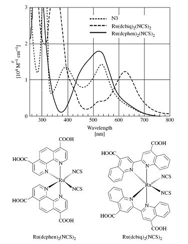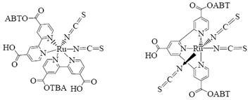 图2 不同玻璃基体材料的FTO紫外-可见光透过率[2] 2.1染料敏化剂对光的利用 由导电玻璃透过的太阳光将被染料吸收,目前公认的较好的光敏染料为钌的联吡啶络合物,其基本化学式为ML2(X)2,其中M代表钌,L代表4,4'-二羧基-2,2'-联吡啶,X代表卤素、氰基、硫氰酸根、乙酰丙酮、硫代氨基甲酸、水等。在这一系列染料中,以N3(红染料)和N719性能最优,应用最广。N3的最大吸收峰在518nm和380nm,对应摩尔消光系数分别为1.3×104 L·mol-1·cm-1和1.33×104 L·mol-1·cm-1。但N3和N719对600nm以上的光谱响应较差,吸收光谱范围与太阳光谱不能很好匹配,因此不能有效利用这部分太阳光。2001年Grätzel等[3]合成了被称为“黑染料”的光敏剂,其结构式为RuL3(SCN)3 (L=三联吡啶三羧酸盐)。图3列出了N3和黑染料的分子结构图。