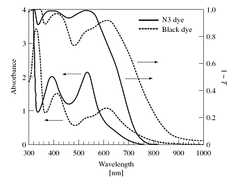 图3 N3和黑染料分子结构图 图4分别给出了N3和黑染料的吸收光谱及光吸收效率,两种光敏染料在可见光波段都具有较高的光吸收,N3的长波吸收能力较差,而在920nm处黑染料仍具有光谱响应,其吸收光谱相对N3红移了大约100nm。据报道用它作为敏化剂的电池在AM1.5太阳光照射下总的光电转换效率达到10.4%[4]。 设计合成性能更加优良的光敏染料体系,进一步提高长波范围的光吸收仍是人们的主要研究方向之一。Kubo等[5]用N719和黑染料制备了叠层结构的染料敏化太阳电池,由于黑染料在近红外具有很好的光吸收性能,可以吸收阈值达1000 nm以内的太阳光,弥补了N719染料在长波范围吸光能力差的缺点,可以提高了电池的光谱响应范围和光电转换效率,结果表明叠层结构的电池比单独用N719或黑染料的电池的光电流提高了20%。