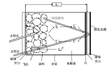 图7 二次利用光的染料敏化太阳电池的改进结构 新的可二次利用光的DSSC的结构示意图如图7所示,即在传统三明治式DSSC电池结构基础上,在镀铂的透明导电玻璃的背面附上一层银反光膜,作为背反射结构。通过银反光膜把从光阳极透过的没有被充分利用的光再次反射回光阳极,已达到二次利用光的目的。对光的反射进一步增加了光在电池光阳极中的传播路径,增加其对光的吸收,从而提高太阳电池的光电转换效率。