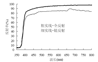 图8 银反光膜的反射光谱 图8是加在DSSC电池对电极背面的美国3M公司生产的银反光膜的反射光谱, 其在400-800nm之间的平均镜反射率是83.6%, 而包括漫反射的全反射率平均是94.6%, 具有较好的反光特性。