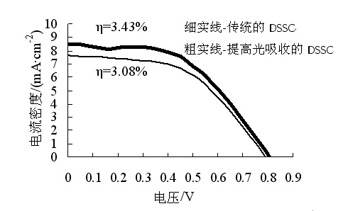 图9  DSSC电池与提高光吸收结构效率对比图 图9是P25粉制备的DSSC电池与加反光膜提高光吸收后的光电转换效率对比图。可以看出,加反光膜后短路电流明显提高,开路电压略有增加,填充因子基本没有改变,加反光膜后电池的效率相对于传统结构电池的提高了11.4%[13-16]。 这种改进结构没有将背反射结构加在染料敏化太阳电池的内部。因为在电池内部光阳极的背面加背反射结构会阻碍电解液的传输。而在对电极用金属薄膜作背反射结构,由于电解液对一般金属都具有强烈的腐蚀作用,在电池的长期运行中,金属薄膜会被腐蚀掉而失去背反射的作用。同时,金属与电解液反应的杂质也可能影响电池的性能。由于对电极是镀铂的透明导电玻璃,纳米级铂膜对透明导电玻璃的透过率影响很小,因此将具有很好的反射率的银反光膜加在电池的背面是一种理想的结构。 染料敏化太阳电池由于弱光性能好,与非晶硅太阳电池一样是室内的主要应用产品,不只是应用在窗户上(需要一定的光透过率),还可以应用在太阳能钟表、超市架上的显示标签和计算器上等,而这些应用对象并不需要电池透明,所以这种新的改进结构,在提高电池效率的同时,仍有较多的应用场合。 3.1立体吸光结构的DSSC[17~19]