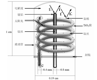图10 立体吸光太阳电池结构示意图 图10是立体吸光电池结构和原理示意图,在螺旋状的钛金属丝的表面镀一层纳米晶TiO2 薄膜并吸附染料作为光阳极,镀铂的钛金属直丝作为对电极放在螺旋状光阳极的内孔中心,装在透明玻璃管内并充入电解液封装成电池。这种结构的特点是:螺旋丝状光阳极使其可以从各个角度吸收阳光,对太阳方位角和光阴影不敏感,具有被动式跟踪阳光的优点,并增大了吸收散射光的面积,通过螺旋状光阳极伸向空间增加对空间的有效吸光面积,而实际安装时只占用圆柱体电池的底面积,从而提高单位底面积上太阳电池的输出功率,节省太阳电池的占地面积。[NextPage]