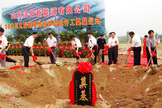 7月8日,山东洁阳新能源20兆瓦太阳能电池组件项目开工奠基。据悉,该项目投资1.6亿元,占地50亩,亩均投资强度320万元,主要生产太阳能电池组件、太阳能灯具和LED光源。该开工项目为一期工程,2010年底建成投产,2010年前建成国内最大的太阳能广电系列产品的生产基地。项目投产后,年产太阳电池组件20兆瓦,LED灯头2万套,太阳能灯具2万套,预计实现销售7亿元,利税1亿元。