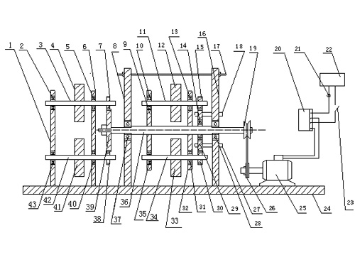 图1中(1)为支架B-1,(2)为轴承B-1,(3)为副轴B-1,(4)为飞轮B-1,(5)为轴承B-2,(6)为支架B-2,(7)为驱动齿轮B-1,(8)为主轴支架1,(9)为支架A-1,(10)为轴承A-1,(11)为副轴A-1,(12)为飞轮A-1,(13)为轴承A-2,(14)为导向轴承,(15)为驱动齿轮A-1,(16)为主轴支架2,(17)为螺栓1,(18)为螺栓2,(19)为皮带轮1,(20)为电度表,(21)为电流表,(22)为电源,(23)为开关,(24)为底座,(25)为电动机,(26)为皮带轮2,(27)为螺栓3,(28)主轴轴承1,(29)为传动齿轮2,(30)驱动齿轮A-2,(31)为轴承A-3,(32)为支架A-2。(33)为飞轮A-2,(34)为副轴A-2,(35)轴承A-4,(36)为主轴,(37)主轴轴承2,(38)为驱动齿轮B-2,(39)为传动齿轮1,(40)为轴承B-3,(41)为飞轮B-2,(42)为副轴B-2,(43)轴承B-4。 支架A-1、A-2的长度L=320mm,两端分别由轴承A-1、A-2、A-3、A-4固定副轴A-1、A-2,公差配合适中。副轴A-1、A-2中部外径分别与飞轮A-1、A-2的中心孔固定连接。飞轮A-1、A-2的直径Φ=148mm,长度L=30mm,重量W=4kg。飞轮A-1、A-2与支架A-1、A-2组合的总质量m=12kg。 副轴A-1、A-2的右端分别与驱动齿轮A-1、A-2的中心孔固定连接。传动齿轮1由螺栓2、3固定在主轴支架2的内侧,其不转动。传动齿轮1外径Φ=195mm,齿数为128齿,传动齿轮1与驱动齿轮A-1、A-2啮合,啮合间隙为0.3mm,驱动齿轮A-1、A-2的外径Φ=65mm,齿数为42齿。速比为1:3.05。电动机功率为1.5kw,转速为1400转/分,以1:1.5转速比驱动主轴,主轴转速为2100转/分。 支架B-1、B-2的长度L=450mm,支架B-1、B-2的下端与底座左边表面固定连接,支架B-1、B-2的上部由轴承B-1、B-2、B-3、B-4固定副轴B-1、B-2,公差配合适中。副轴B-1、B-2的外径中部与飞轮B-1、B-2的中心孔内径固定连接。飞轮B-1、B-2的直径Φ=148mm,长度L=30mm,质量m=4kg。副轴B-1、B-2的右端外径与驱动齿轮B-1、B-2的中心孔固定连接,驱动齿轮B-1、B-2的外径Φ=65mm,齿数为42齿。传动齿轮2外径Φ=195mm,齿数为128齿,其中心孔与主轴的左端外径固定连接,其可随主轴转动。传动齿轮2与驱动齿轮B-1、B-2啮合,啮合间隙为0.3mm,速比为1︰3.05。 所述实验机械装置的电度表的计量量度数值1kw=625转